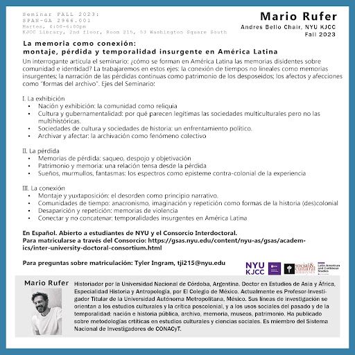During his stay at KJCC in Fall 2023, he will teach the graduate seminar “La memoria como conexión: montaje, pérdida y temporalidad insurgente en América Latina” on Tuesdays, from 4:00 pm to 6:00 pm. More information below: