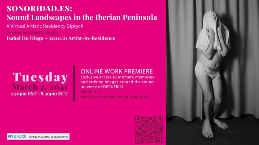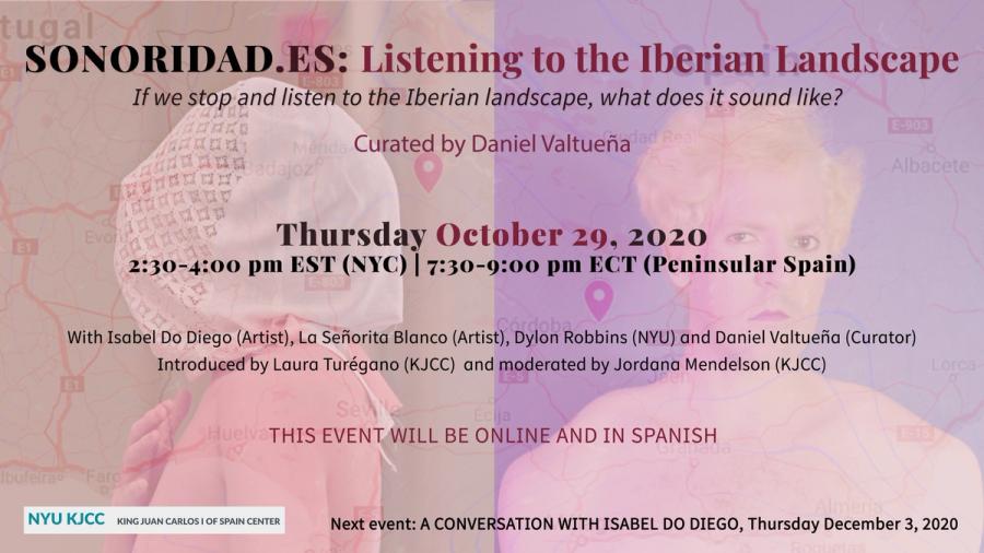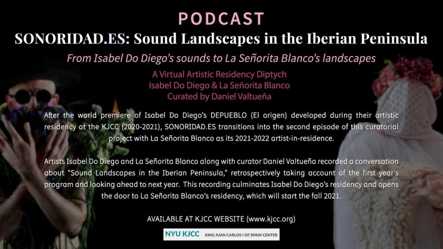 In the Fall 20 semester, NYU King Juan Carlos I of Spain Center inaugurated its first program of artistic residencies, which furthers the Center’s promotion of Iberian and Spanish-speaking cultures by creating a formalized structure for the regular support of the visual and performing arts. The artistic residencies aim to promote the creation of original artworks by specifically commissioning artists to develop new work for either an online or in-person format. Conceptualized and curated by Daniel Valtueña this Artist-in-Residence program will run from 2020-2022, centering the voices of two different artists, one in residence for each year. Inspired by the need to listen to the pandemic times we live in, this first iteration of the program was titled SONORIDAD.ES: Sound Landscapes in the Iberian Peninsula and includes the artists Isabel Do Diego and La Señorita Blanco.